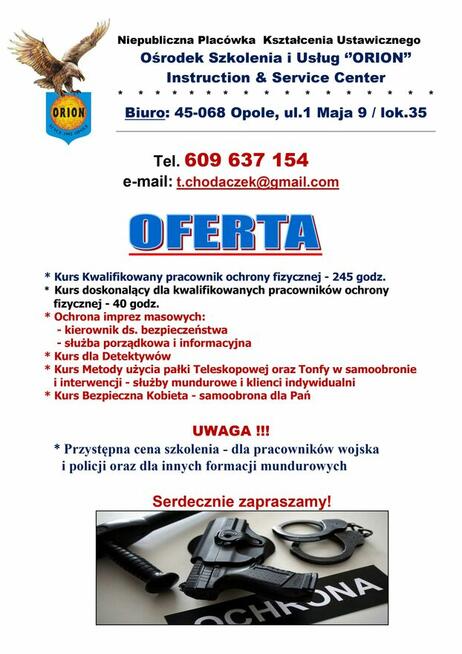 Prowadzimy Kursy dla pracowników ochrony: - doskonalące - zawodowe - detektyw - ochrona imprez masowych